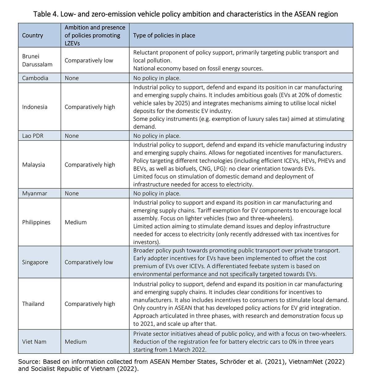 There are also several differences between groups of countries in their promotion of electric vehicles (Table B). Automobile-producing countries in the region (Thailand, Indonesia, and Malaysia) have adopted policies promoting LZEV production. Brunei Darussalam and Singapore have enacted LZEV policies with a greater focus on public transport. However, countries with a lower industrial base, including Cambodia, Lao PDR and Myanmar, have not yet developed any policy support for a transition to low- and zero-emission vehicles.