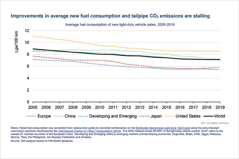 Urgent action is needed by policymakers to reduce CO2 emissions from vehicles globally says the new benchmarking report ‘Vehicle fuel economy in major markets 2005-2019’ for the Global Fuel Economy Initiative (GFEI) by partner the International Energy Agency (IEA).